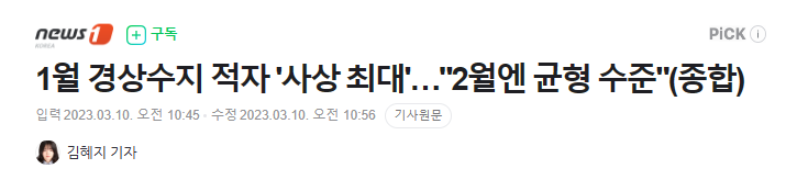 지난 1월 경상수지가 사상 최대 규모인 45억 달러 적자를 기록. 반도체 수출 급감에 따른 '최악' 성적. 한은이 통계를 편제한 1980년 이후 가장 큰 규모.