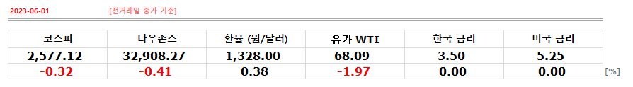 코스피지수는 전거래일 기준 0.32% 하락한 2,577.12, 다운존스지수는 0.41% 하락한 32,908.27, 원달러환율은 0.38% 오른 1,328.00 [원/달러]에 마감했으며, 유가 WTI는 1.97% 하락한 68.09 [USD/BBL]에 마감됐다.