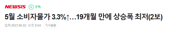 - 지난달 소비자 물가지수는 111.13(2020년 = 100)으로 1년 전보다 3.3% 상승, 지난해 5월 5.4%였던 높은 물가상승률에