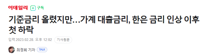 지난 달 금통위가 1월 기준금리를 3.5% 인상 이후 동결 신호를 내보내자, 시장 금리가 하락했으며, 단기 CD 금리가 기준금리 아래를 맴돌기도 했습니다. 또한  금융당국의 압박으로 예금 및 대출금리 하향시키라고 했습니다. 그로 인한 영향인 듯합니다. 은행 가계대출 금리, 주택담보대출 금리, 일반 신용대출 금리, 기업대출 금리 모두 하락했습니다. 반면 비은행 금융기관의 수신금리는 하락했으나 대출 금리는 상승했습니다.