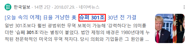 • 클린터 행정부 이후 세계무역기구 중심의 자유무역 기조에 밀려 사문화했던 슈퍼 301조를 트럼트 대통령이 부활시켰다.