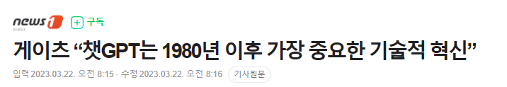 빌 게이츠 MS 창업자가 "오픈 AI의 챗 GPT는 지난 1980년 이후 가장 중요한 기술적 혁신"이라고 극찬. "GUI를 처음 본 이후 가장 큰 충격이었다"며 " 가장 중요한 기술적 발전"이라고 말했다. "전체 산업이 이를 중심으로 방향을 바꿀 것이며, 기업은 AI를 얼마나 잘 활용하느냐에 따라 차별화될 것"이라고 강조. MS 검색 엔진 빙은 GPT-4 시스템을 사용하고 있다.