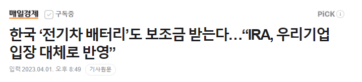 미국 정부, 인플레이션감축법(IRA)의 전기차 보조금 관련 세부 지침 발표. 한국 등 외국산 전기차 보조금 지급 대상에서 제외해 차별 논란이 있었음. 전기차에 들어가는 배터리의 50% 이상이 북미산 부품 또는 미국과 FTA을 맺은 나라에서 가공한 광물을 40% 이상 사용할 경우 전기차 한 대에 각각 3,750달러씩 최대 7,500달러의 보조금을 받을 수 있음. 매년 단계적으로 상향됨.