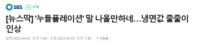 외식물가, 냉면 한 그릇이 1만 6천 원. 냉면뿐 아니라 짜장면 등 각종 면 종류 음식값이 크게 오르며 '누들플레이션'이라는 말까지 등장. 평양냉면 전문점, 지난달 20일부터 냉면값 1만 5천에서 1만 6천 원으로 올림. 지난해 초 인상후 1년여 만에 또 올림. 짜장면 가격은 자년보다 13.9% 올라 외식 품목 중 가장 많이 올림.