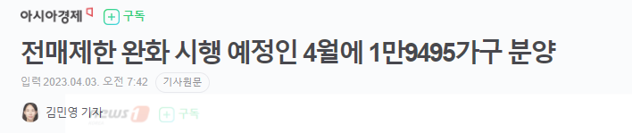 4월, 전국 총 2만 7399가 중 중 1만 9495 가구가 일반분양할 예정, 작년 동월 물량에 비해 일반분양은 7070 가구가 늘어남.  당초 3월 중으로 예정됐던 전매제한 완화 시기가 이달 시행될 예정이어서 분양 시장에 어떤 영향이 미칠지 주목됨. 전매제한이 완화가 시행되면 수도권은 최대 10년, 공공택지 및 규제지역은 3년, 과밀억제권역은 1년, 그 외 지역은 6개월로 완화. 기존 분양아파트도 소급 적용.