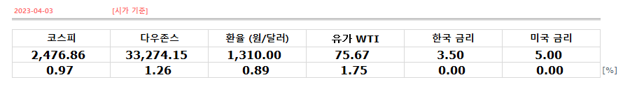 전거래이보다 코스피는 0.97% 상승, 다우존스는 1.26% 상승, 환율 0.89% 상승, 유가 WTI 1.75% 상승했습니다.