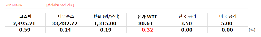코스피지수는 전거래일 기준 0.59% 상승으로 2,495.21, 다우존스는 0.24% 상승 33,482.72, 환율은 0.19% 오른 1,315원을 기록했으며 유가 WTI는 0.32% 하락한 80.61이다.