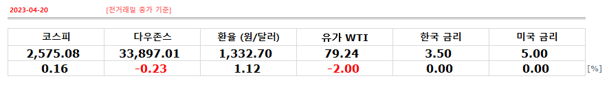 코스피지수는 전거래일 기준 0.16% 상승한 2,575.08, 다운존스지수는 0.23% 하락한 33,897.01, 원달러환율은 1.12% 오른 1,332.70 [원/달러]에 마감했으며, 유가 WTI는 2.00% 하락한 79.24 [USD/BBL]에 마감됐다.