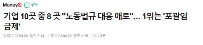 - 대상 : 기업 289개사, '현행 노동법규상 HR의 애로사항'을 조사한 결과 81%가 법규에 대한 어려움을 겪고 있다'