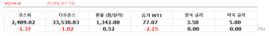 코스피지수는 전거래일 기준 1.37% 하락한 2,489.02, 다운존스지수는 1.02% 하락한 33,530.83, 원달러환율은 0.52% 오른 1,342.00 [원/달러]에 마감했으며, 유가 WTI는 2.15% 하락한 77.07 [USD/BBL]에 마감됐다.