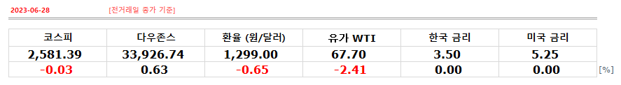 코스피지수는 전거래일 기준 0.03% 하락한 2,581.39, 다운존스지수는 0.63% 상승한 33,936.74, 원달러환율은 0.65% 내린 1,299.00 [원/달러]에 마감했으며, 유가 WTI는 2.41% 하락한 67.70 [USD/BBL]에 마감됐다.