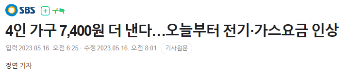 ▷ 전기와 가스요금이 16일부터 5.3% 인상, 4인 가구 기준 전기요금 3천원, 가스요금, 약 4천 원 정도 추가 발생