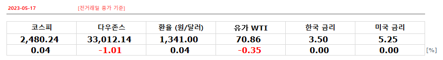 코스피지수는 전거래일 기준 0.04% 상승한 2,480.24, 다운존스지수는 1.01% 하락한 33,012.14, 원달러환율은 0.04% 오른 1,341.00 [원/달러]에 마감했으며, 유가 WTI는 0.35% 하락한 70.86 [USD/BBL]에 마감됐다.