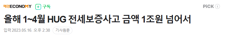 - 4월 전국에서 발생한 전세보증사고 금액은 2857억 (1273건), 1월부터 4개월 만에 1조 원 돌파
