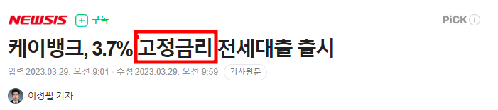 케이뱅크, 대출금리 이날 기준 고정금리형 전세대출 상품 연 3.7%(대출기간 2년) 출시. 신용 등급 상관없이 단일 금리가 적용, 대출만기까지 금리 변동 없음.