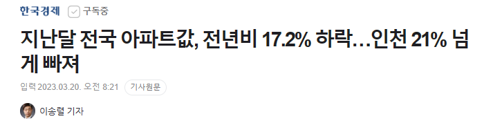 부동산 플랫폼 직방 분석, 전년 대비 17% 이상 하락, 17개 시도 중 인천시는 20% 넘는 최고의 하락률을 보임. 대구, 세종을 제외한 지역은 22년 7월부터 마이너스 추세로 돌아섰다고 분석. 수도권과 세종시는 하락 추세 둔화, 일부 반등 포착됐지만 여전히 10%넘는 하락률를 기록중. 미 중아은행은 추가 금리인상을 시사하는 긴축 기조가 당분간 지속될 수 있으므로 시장 동향 예상은 힘듬.