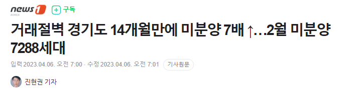 "2023년 2월 아파트 매매거래량은 3만1337세대를 기록하며 증가세로 전환됐다."라고 현대차증권 연구원의 말이다. 전년동기대비 198.7% 큰 폭으로 늘었지만 전원대비 증가세는 0.1%. 미분양 선행지표인 매매거래량이 빠르게 반등은 긍정적 신호로 해석