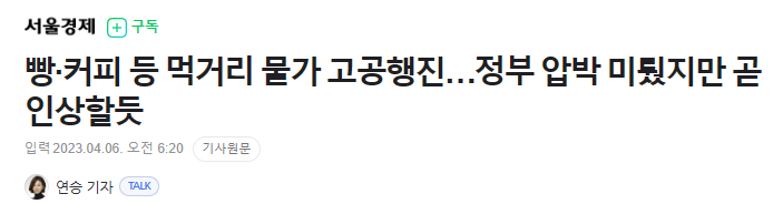 소비자 물가가 주춤하는 모양새이지만 먹거리 물가는 여전히 고공행진. 6일 통계청 국가통계포털에 따르면 지난달 소비자물가지수는 110.56, 작년동월보다 4.2% 상승. 외식 물가 상승률은 아직도 전체 소비자물가 상승률의 1.8배, 가공식품은 2.2배 수준. 빵과 도넛 등의 먹거리 가격은 이번 달에 또 상승예정.