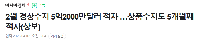 7일 한국은행이 발표, 올해 2월, 국낸 경사수지는 5억 2천만 달러 적자 기록, 상품수지는 전년 동월 43억 5천만 달러 흑자에서 13억 달러 적자로 전환, 서비스수지 운송수지가 적자 전환, 본원소득수지는 31억 2천만 달러 흑자,
